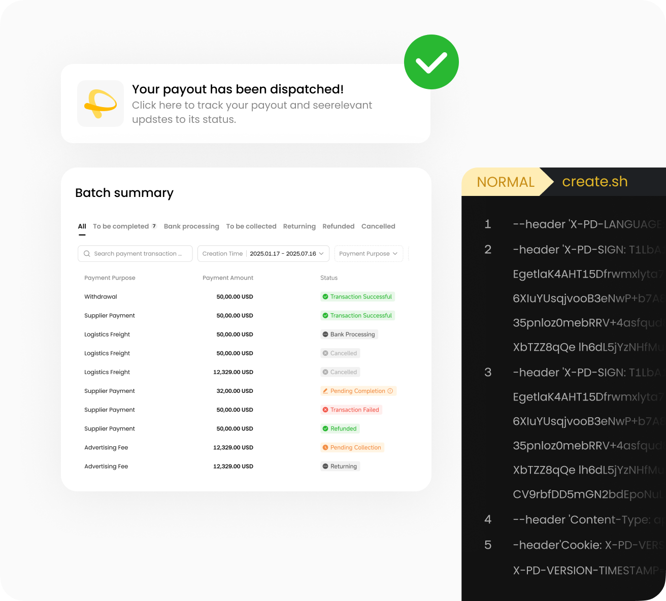 Track payouts in real time with status updates and exception reporting.